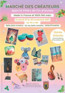 Le marché des créateurs vous accueillera du 27 au 30 novembre 2026 de 11h à 18h à la salle Saint Antoine à Etampes.